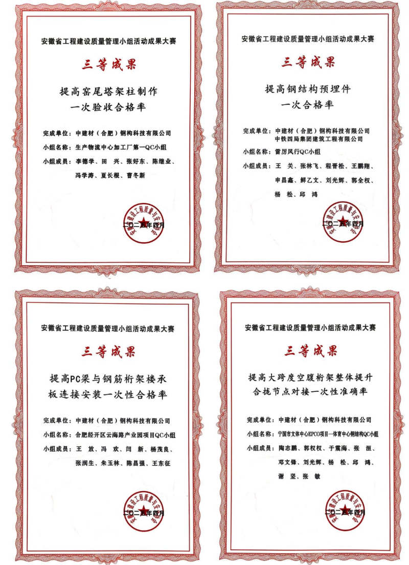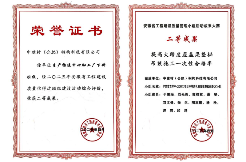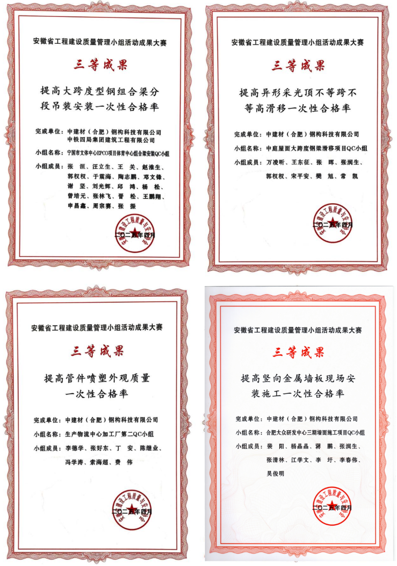 近日,在安徽省工程建設(shè)質(zhì)量管理小組活動成果大賽上,中建材鋼構(gòu)公司憑借扎實的技術(shù)功底、卓越的質(zhì)量管理水平和持續(xù)的創(chuàng)新精神,一舉斬獲10項優(yōu)秀成果大獎!其中包括2項二等獎、8項三等獎,獲獎數(shù)量和質(zhì)量均位居行業(yè)前列,充分展現(xiàn)了中建材鋼構(gòu)公司在工程建設(shè)領(lǐng)域強大的綜合實力和核心競爭力。